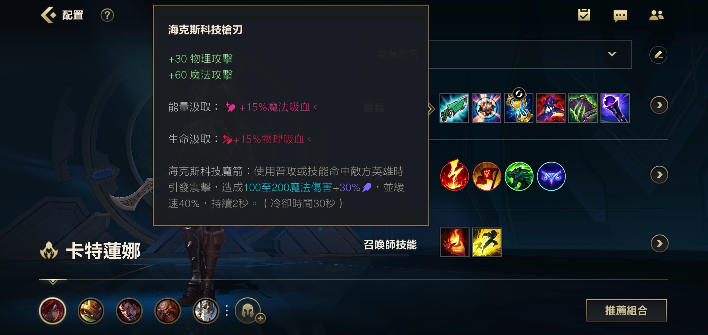 首先第一件装备我们就选科技枪,这件装备对卡特来说再合适不过了——毕竟卡特是需要进场打输出的AP刺客,而大家都清楚,刺客英雄的血量通常都偏低。