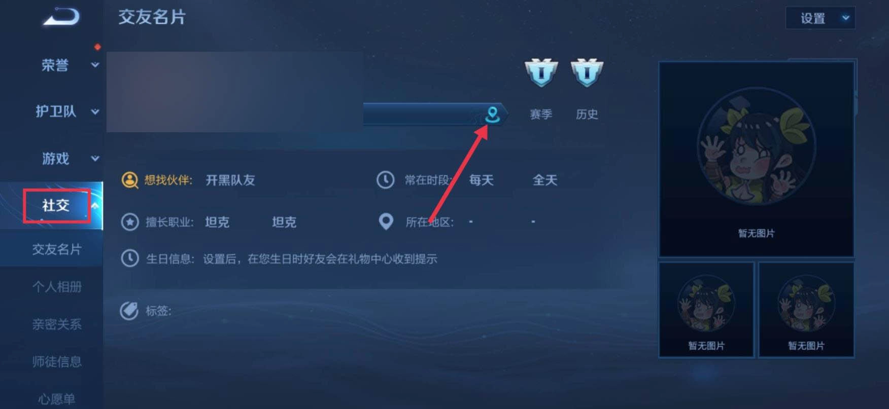 1首先要进入游戏,点击自己的头像进入个人主页,接着点击左侧菜单栏中的“社交”选项,跳转到社交页面后,就可以看到自己的荣耀战区信息了。