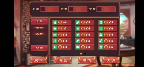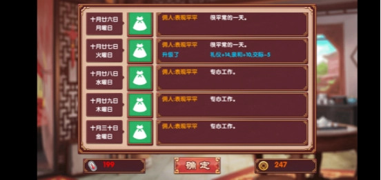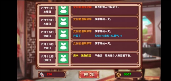 2、佣人:这是游戏初期就能承接的工作,刚开始做一次能赚14金钱,还能提升14点礼仪和10点亲和,不过会降低5点交际。和课程比起来,这个选择性价比挺高的,既能赚钱又能提升属性,是我们刚开局时的最优选择。