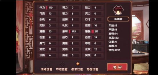 而一开始就提升礼仪的话,既没有能参加的比赛,也无法获得那么多收益。所以小编建议各位新手不要盲目提升礼仪,应当先把其他属性提升起来,等到游戏中后期再考虑提升礼仪,这样才能形成良性循环。