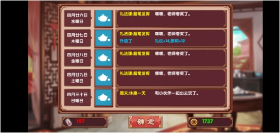2、礼法课:每次升级能提升14点礼仪与12点亲和,是游戏初期提升礼法属性的主要途径,每月大约可增加100点,且随着等级的提升,增加的点数会越来越多。