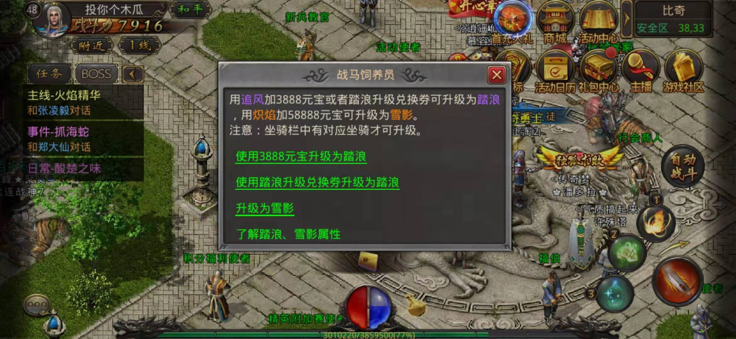 在已经获得追风的基础上,消耗3888元宝就能将其升级为踏浪,这便是我们所期望的白马了。尽管投入了不少元宝,但踏浪带来的属性提升远胜于追风。