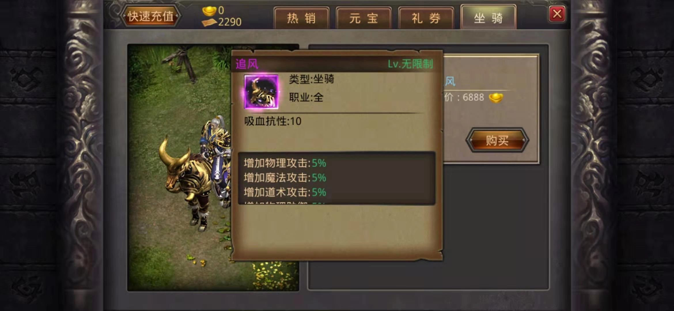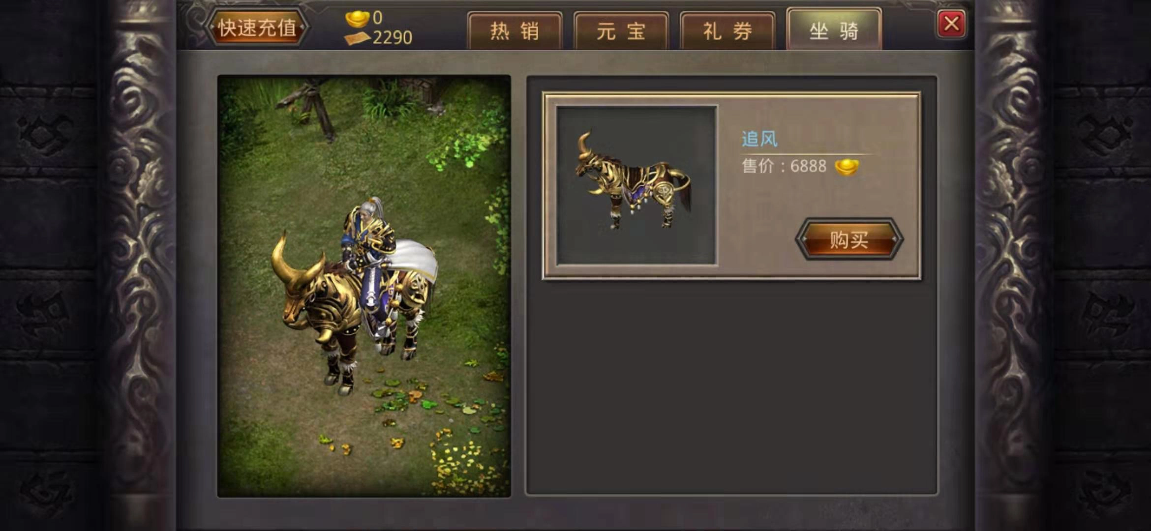 最初级的坐骑是追风,它只能在系统商店里用6888点元宝购买,这个价格让绝大多数玩家都难以获得坐骑。