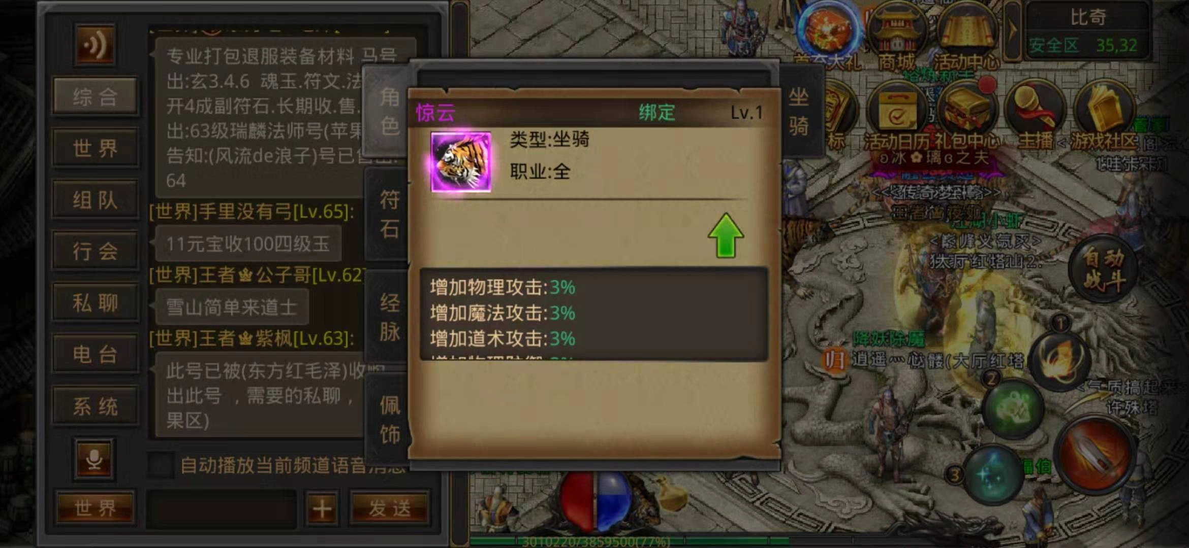 在热血传奇手机版里,坐骑不像其他游戏中那样随处可见,而是被设定成精英玩家的标志——这是因为哪怕是最基础的坐骑都很难获取,更别提后续的进阶版本了,因此拥有坐骑在游戏里绝对是件十分炫酷的事。