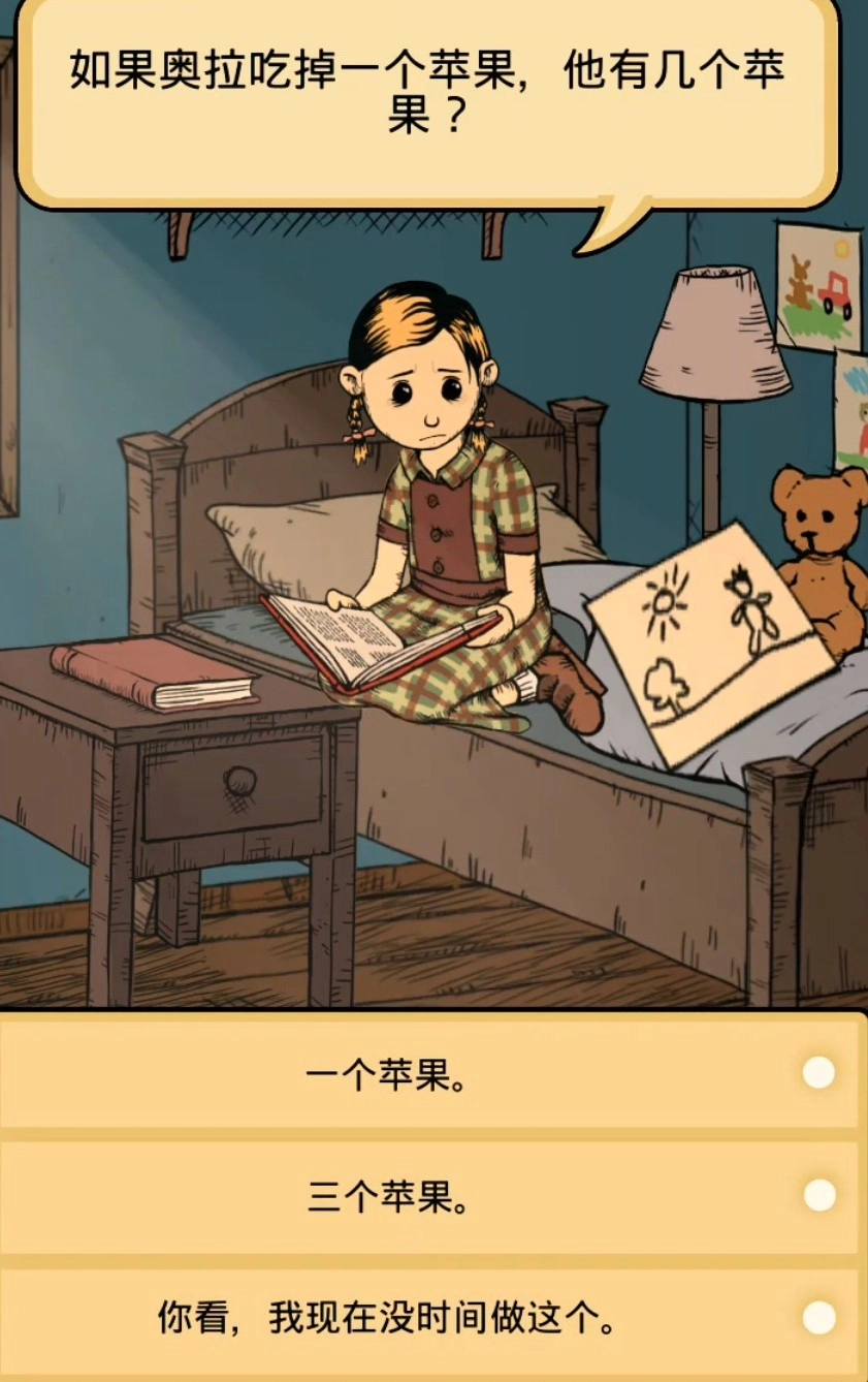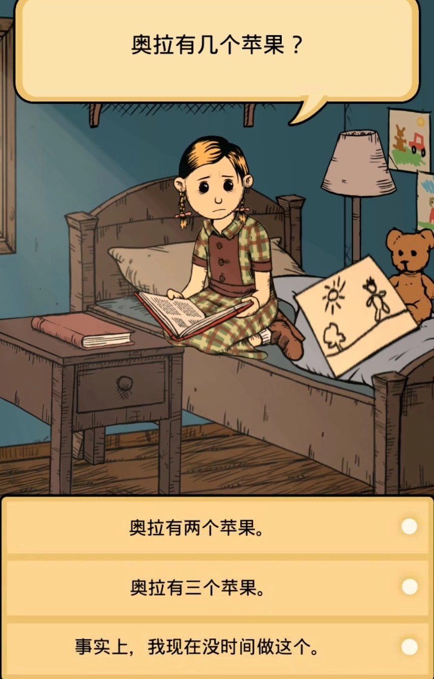 在孩子提出的第一个问题中,林恩和奥拉各自有一个苹果。当林恩把自己的苹果递给奥拉之后,奥拉总共会有几个苹果呢?这个问题其实就是简单的加减法运算,不存在脑筋急转弯之类的隐藏陷阱,玩家直接回答“两个”就可以了。