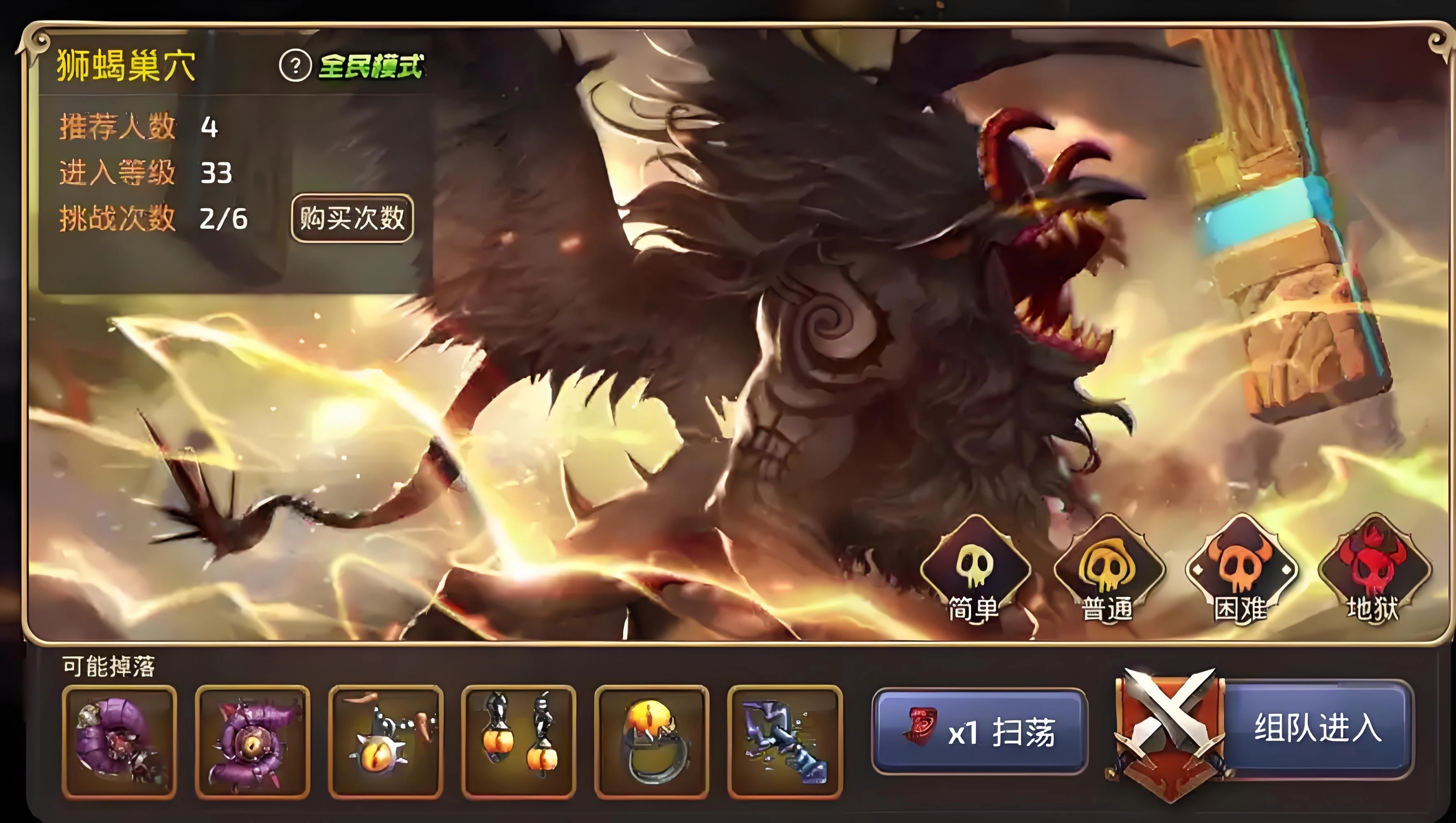 飞天砸地同样是一个在空中施展的技能,施展该技能时,狮蝎会先腾空而起至半空中,随后朝着地面上的红色区域猛力砸落。