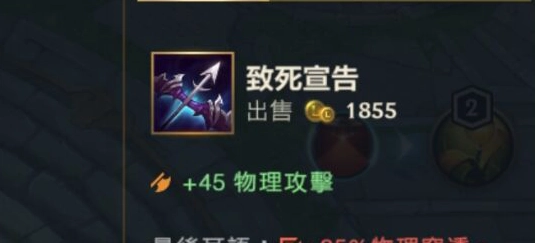 游戏开局时,我们可以先买一把长剑,这样能提升对线和补兵的能力。接着在对线过程中逐步攒出风暴巨剑,用来合成无尽之刃。无尽的属性加成直白又强力,不仅加55点攻击力,还有25%暴击率,被动还能强化暴击伤害,让输出能力得到显著提升。等无尽之刃做出来后,我们就具备和对手正面硬拼的实力了。