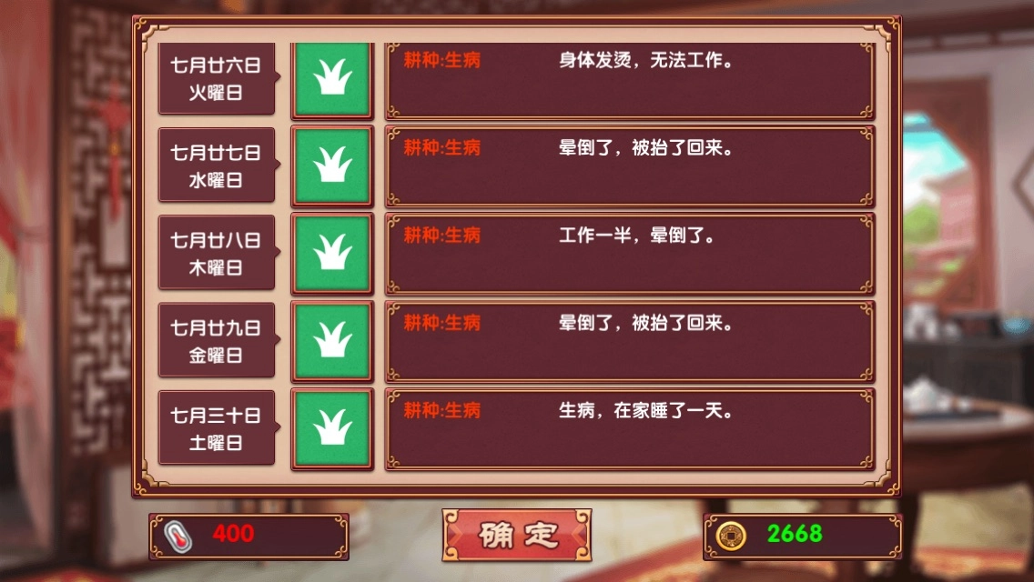 小姐病倒后,老管家便会提醒父亲,得带小姐去回春楼诊治。此时需立刻前往回春楼,点击治疗选项,这会消耗600个金钱。同时,还得在日程中安排休息,把疲劳值降至绿色区间,这样才能重新开始工作和学习。要是不这样做,生病期间无论是学习课程还是工作,都无法获得任何收益。