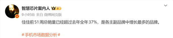 12月30日,数码博主“智慧芯片案内人”公布的销量数据表明,2025年前51周期间,一加手机的累计销量较去年全年销量增长超37%,在各主副品牌里是销量增长幅度最大的品牌。