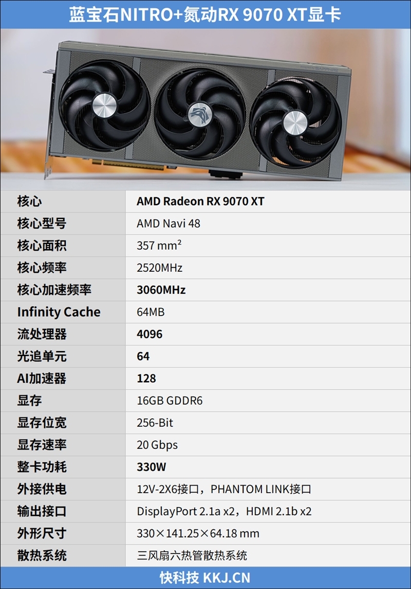 蓝宝石NITRO+氮动RX 9070 XT显卡采用AMD Radeon RX 9070 TX核心打造,运用4nm制程工艺,配备4096个流处理器、64个光追单元与128个AI加速器;其核心基础频率为2520MHz,加速频率可突破3GHz,达到3060MHz,还搭载了64MB的Infinity Cache;显存规格上,该显卡拥有16GB GDDR5显存,显存位宽为256-Bit,显存速率最高可达20Gbps。