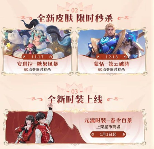 全新皮肤【安琪拉-糖果风暴】与【蒙恬-苍云破阵】将开启限时秒杀活动,仅需60点券即可入手,价格十分超值。
