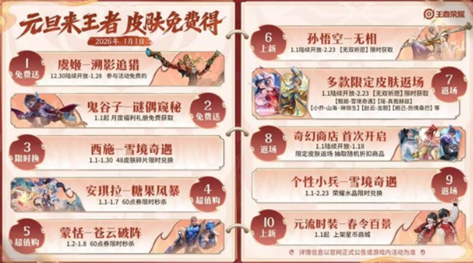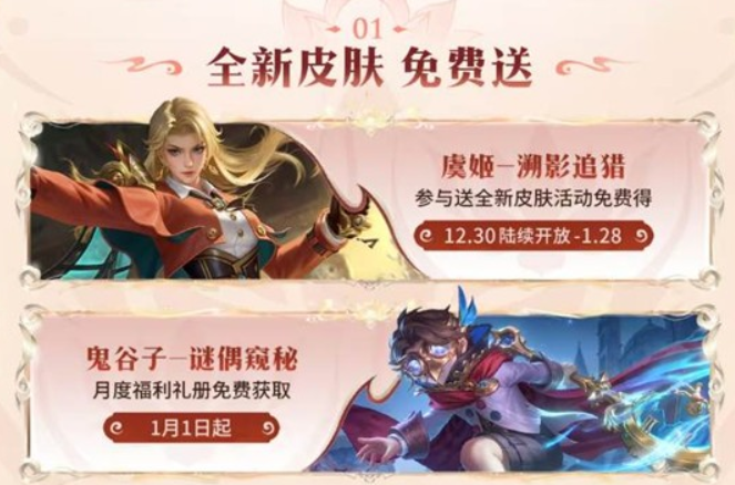 参与限时活动,就能免费获取全新皮肤【虞姬-溯影追猎】。完成月度福利礼册的任务,全新皮肤【鬼谷子-谜偶窥秘】等你来免费领取。