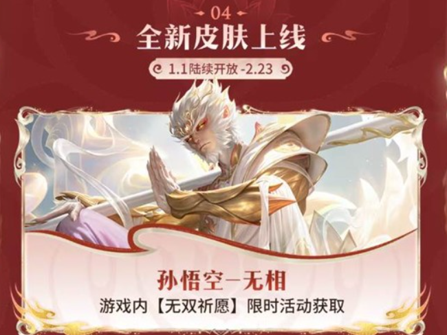 全新皮肤【孙悟空-无相】将以祈愿活动的形式限时推出。此外,【甄姬-雪境奇遇】、【瑶-真我赫兹】、【小乔-山海·琳琅生】、【赵云-龙胆】及【妲己-热情桑巴】等多款高人气皮肤,也会借由祈愿活动迎来限时返场。