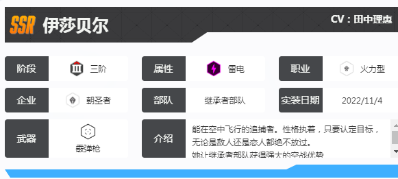 伊莎贝尔是朝圣者企业推出的火力型角色,性格颇为执着,一旦确定目标,无论是敌人还是在乎的人,都绝不会轻易放过。胜利女神新的希望伊莎贝尔究竟是怎样的角色呢?许多玩家或许还不太了解,接下来就为大家详细介绍一下。