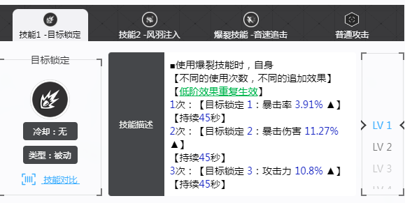 在战斗机制上,技能设计主要围绕目标锁定来构建,这是一个被动技能,并且会与爆裂技能形成联动。每当使用爆裂技能时,都能触发不同的追加效果:通常首次使用可提升暴击率,第二次使用则会追加暴击伤害。