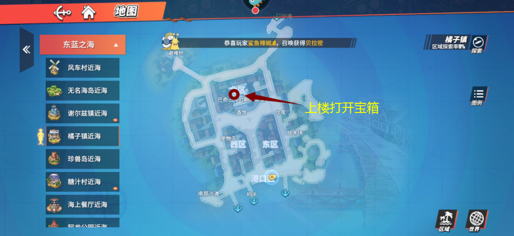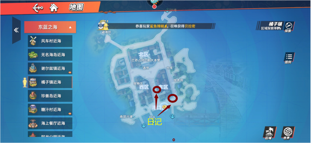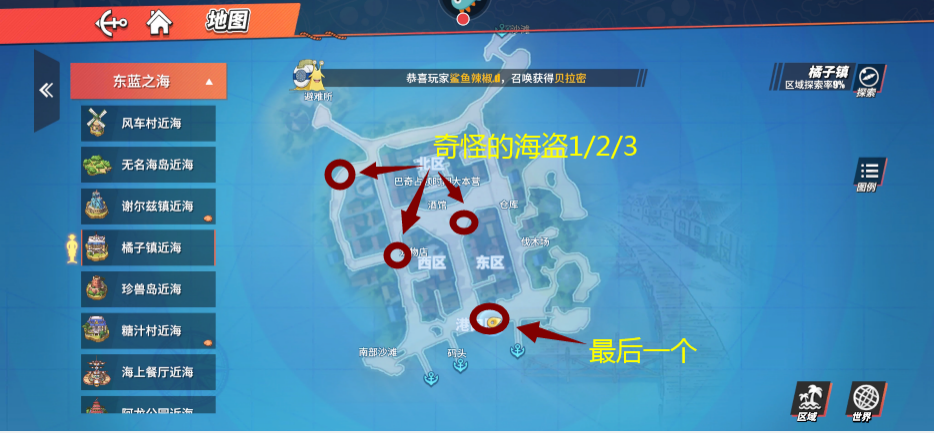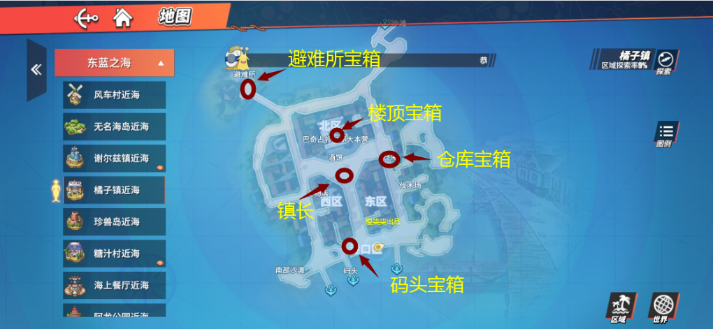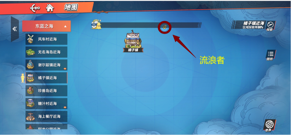 1. 玩家抵达橘子镇后,从船埠往西行进可抵达南部海滩,接着能看到黑色的探查气球,玩家探查该气球后能得到二十个金子之果。2. 在橘子镇东区货仓附近,玩家需绕到山的后面才能到达,到达后就能在山上看到探查气球,探查后可获取二十个金子之果。3. 玩家从橘子镇口岸一直向东走,抵达最东边的海滩,会看到一个箱子,箱子位置十分明显,打开后就能获得三万贝里。
