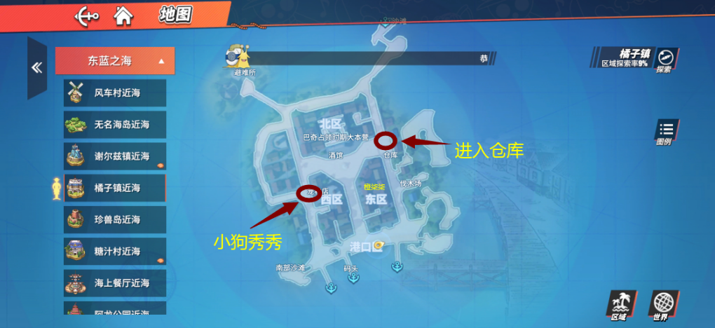 前往橘子镇中心,找到镇长领取活动任务,之后前往左上方的避难所打开箱子,再去右侧货仓处开启箱子,接着前往巴奇大本营(位于酒吧楼上,记得上楼!),到楼顶打开箱子,最后前往船埠开启箱子,完成后返回镇长处提交活动任务。现在启动【熟悉狗狗秀秀活动】