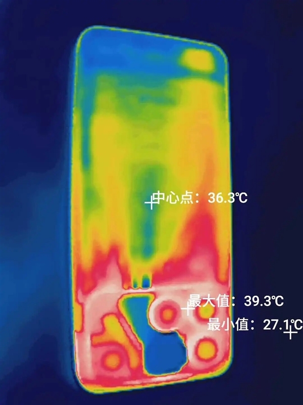 而机身背面最高温度连 40 度都不到,从测温图也能看出来风扇和风道是一大片蓝色,跟机身其他区域形成鲜明对比,这风扇有事儿是真上啊。。。