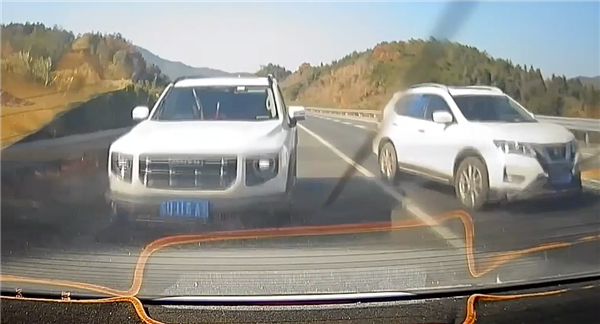 慢车道上的一辆小车突然紧急减速并向左避让,不料被从快车道后方驶来的另一辆小车追尾,导致两车均有损坏,好在没有人员受伤。
