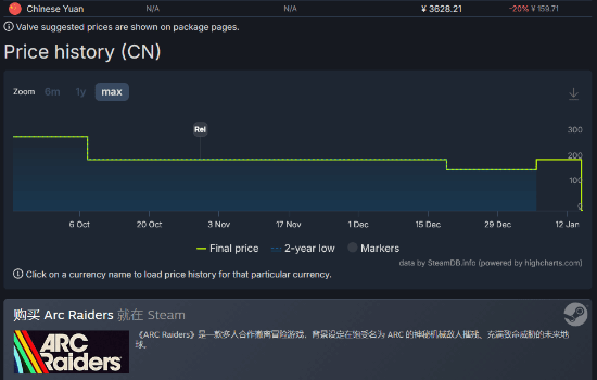 截至目前,由Embark Studios开发的搜打撤游戏《Arc Raiders》已从Steam国区下架,大陆IP或国区账号已无法搜索到该游戏。根据SteamDB数据,该游戏的国区价格现已显示为无,而此前一天其售价仍为199.64元。