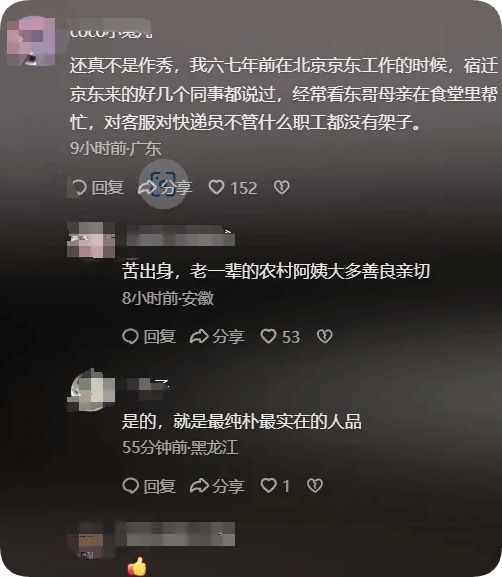 有曾在北京京东任职的网友留言表示:“这真不是作秀,六七年前我在北京京东工作时,从宿迁京东过来的好几位同事都提到,常看到东哥母亲在食堂帮忙,不管是客服、快递员还是其他职工,她都没有一点架子。”