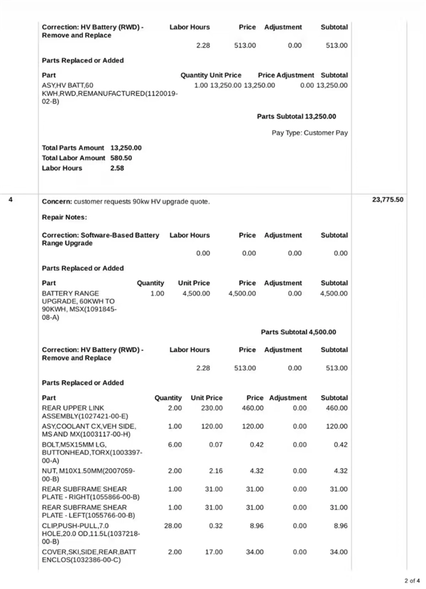 他前往美国威斯康星州麦迪逊的特斯拉服务中心进行维修,特斯拉给出了两个方案:一是更换同款60kWh电池包,二是升级为90kWh电池包。