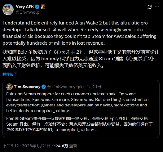 我明白Epic全额资助了《心灵杀手2》,但Remedy好像因为没办法在Steam平台销售这款游戏,可能会损失数亿美元收入,进而陷入财务危机(……)这样的说法实在难以让人相信。