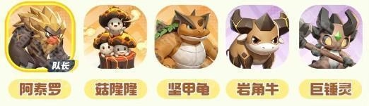 阵容配置:阿泰罗(担任队长)、菇隆隆、坚甲龟、岩角牛与巨锤灵。