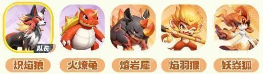 阵容配置:炽焰狼(担任队长)、火燎龟、熔岩犀、焰羽猴与妖焱狐。
