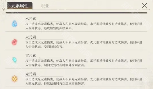 战斗角色按元素属性可划分为水、火、雷、光、暗五种类型,战斗中遭遇的怪物存在各异的元素弱点,玩家能够依据怪物的弱点来挑选对应的元素角色进行应对。此外,不同元素造成的伤害还具备各自独特的效果加成。