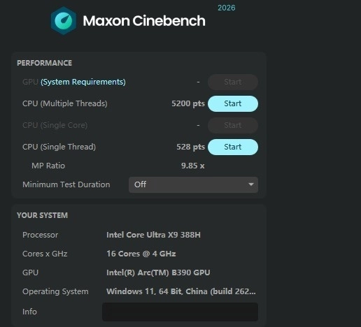在CINEBENCH 2024测试体系中,酷睿Ultra X9 388H处理器的单核成绩为132分,多核成绩达1329分,展现出优异的性能表现。此外,在最新推出的2026测试标准下,该处理器的单核得分提升至528分,多核得分则达到5200分。后续我们还将逐步增加更多处理器的CINEBENCH 2026测试数据,以便大家能在新的测试标准下更直观地对处理器性能进行评估与比较。