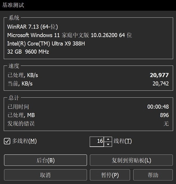 WinRAR压缩/解压缩基准处理速度平均达到了20977 KB/s,16线程带来的性能提升还是比较明显的。