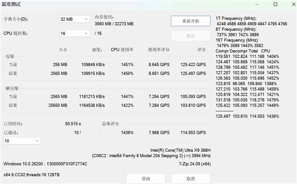 首先是压缩和解压缩,7-Zip压缩速度109915 KB/s,解压缩速度1164538 KB/s,总评分114.553 GIPS,10轮压缩解压缩测试耗时仅50.515秒,速度极快。