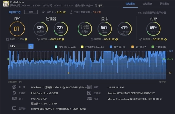 《明日方舟:终末地》是刚刚上线的一款3D即时策略RPG游戏,画面制作精良,对硬件性能要求是比较高的。在1920×1200分辨率,开启最高画质的情况下,锐炫B390核显运行游戏的平均帧率为87fps,流畅运行无压力。