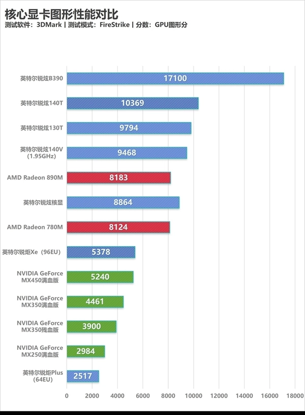 下图是3DMark FireStrike模式历代核显的测试成绩,大家可以此为参考对锐炫B390的性能有一个更为直观的了解: