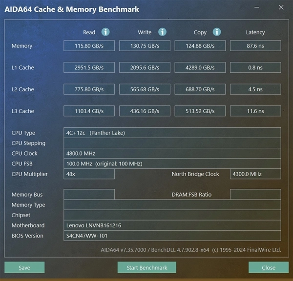 从AIDA 64内存性能测试来看,读取速度达到了115.8 GB/s,写入速度130.75 GB/s,拷贝速度124.88GB/s,这意味着从Panther Lake开始,移动级平台的内存性能全面突破百GB/s速度大关。