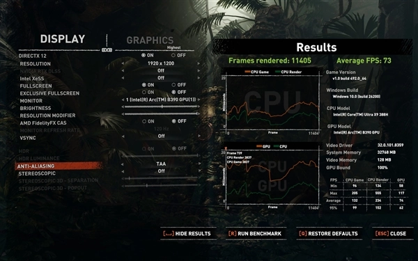 我对《古墓丽影:暗影》这款游戏进行了XeSS开关状态的测试,情况如下:当游戏设置为1920×1200分辨率与最高画质时,关闭XeSS功能后,平均帧率达到73fps;而开启XeSS的性能、平衡、画质、超高画质这四个档位后,在相同的1920×1200分辨率和最高画质条件下,平均帧率依次为104fps、94fps、87fps、77fps。由此可见,运行这类推出时间稍早的3A游戏是完全没有压力的。