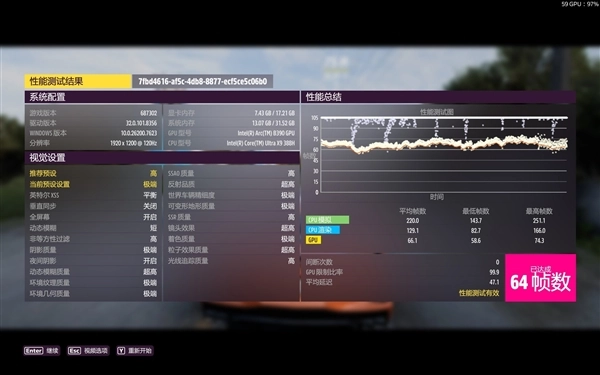 《极限竞速:地平线5》对于硬件的优化非常到位,所以锐炫B390跑起来也是相当顺畅,1920×1200分辨率,极端画质下,平均流畅度可以达到64fps,这对于集成显卡来说已经是相当出色的表现了。