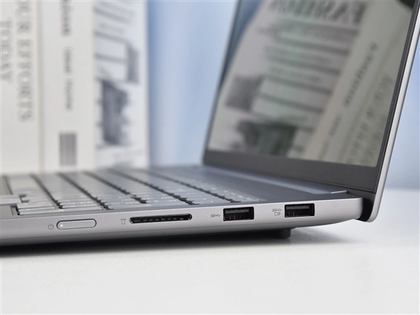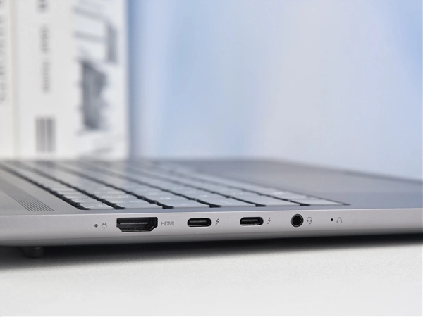 机身右侧的2个USB 3.2 Gen 1 Type-A使用便捷,标准SD读卡器相比不少产品配备的MicroSD读卡器更加实用。另外电源键设计在侧面的话,外接显示器就会更加方便,开机时不用打开屏幕。