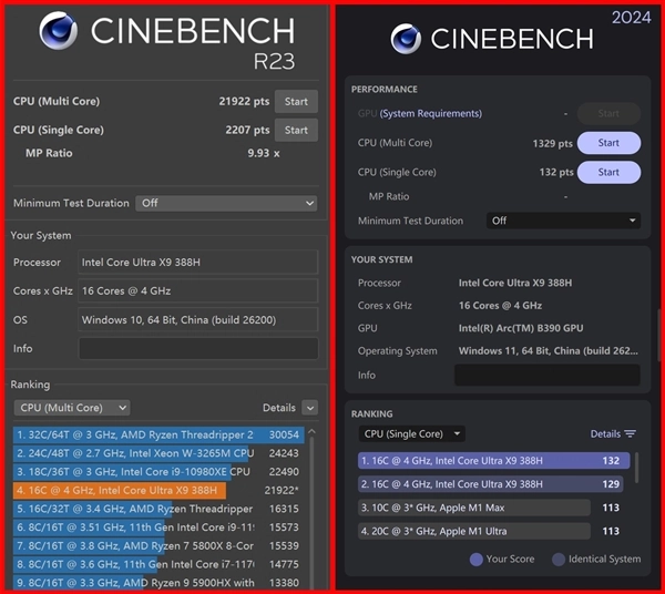 其实从R23和2024单核和多核测试来看,酷睿Ultra X9 388H处理器与上一代酷睿Ultra 9 285H做对比的话(R23单核2015、多核21403,2024单核121,多核1147),已经实现了全面超越。