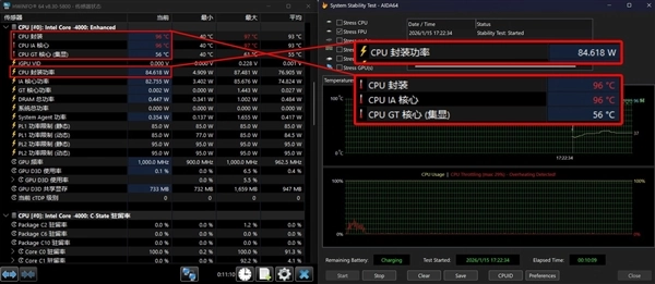 AIDA 64+FurMark CPU+GPU双拷机测试,CPU封装功率依旧稳定在85W,此时整体封装温度会下降到84℃,所以在日常使用的时候完全无需担心温度问题。