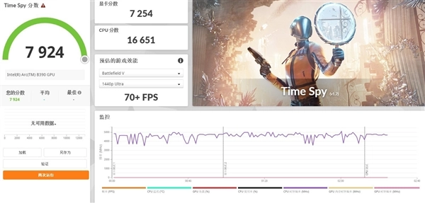 我们先来通过3DMark理论测试看看锐炫B390的图形性能表现。在Time Spy DX12测试标准下,B390图形性能评分达到了7254分,这个性能其实比较接近此前65W超低功耗的RTX 4060独显的性能水准。另外Steel Nomad Light测试得分6283分,在集成显卡里确实是有着天花板级别的图形性能表现。