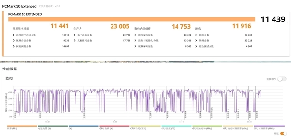 说明其完成这些基础办公任务没有任何问题;生产力项目测试中得分高达23005分,表明其拥有卓越的电子表格、文档工作性能;数位内容创作评分高达14753分,说明其能够非常高效地完成图片、视频编辑、图形渲染等工作;游戏性能评高达11916分,游戏体验出色。