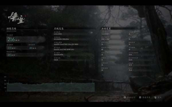 《黑神话:悟空》在1920×1200分辨率、低画质,开启4倍多帧生成的情况下,平均帧率可以达到216fps,而且《黑神话:悟空》这款游戏对于GPU性能的敏感度极高,因此可以充分体现出这一代锐炫B390核显的图形性能到底提升有多大。