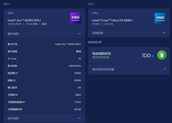 酷睿Ultra X9 388H处理器集成了锐炫B390核显,拥有12个Xe核心,可用显存为18GB,显存频率2500MHz,这可以说是英特尔目前为止最强的核显。而且因为GPU tile从Compute tile中分离出来,后续在核心规模的调配方面自然会更加灵活。