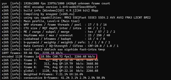 再来看看视频编码,这是英特尔酷睿处理器一直以来的强项。x264 Benchmark编码2500帧耗时仅为24秒,帧速率104.86fps;x265 Benchmark编码1128帧,耗时仅18.58秒,帧速率60.72fps,速度极快,是目前编码性能最强的移动级处理器。