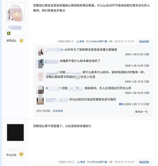 当然也会有一些不同的声音,觉得涅槃组这类低水平的比赛原本就没什么人关注,即便取消了也不会造成什么影响,直接播放录播内容也可以。
