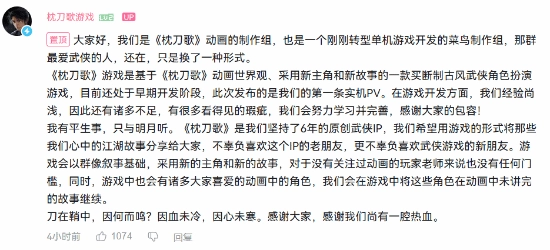 《枕刀歌》游戏官方在发布PV之际,也同步发布了一篇文章。官方自嘲是“单机游戏开发的菜鸟制作组”,并坦言:“那些最热爱武侠的人,依然存在,只是换了一种方式。”
