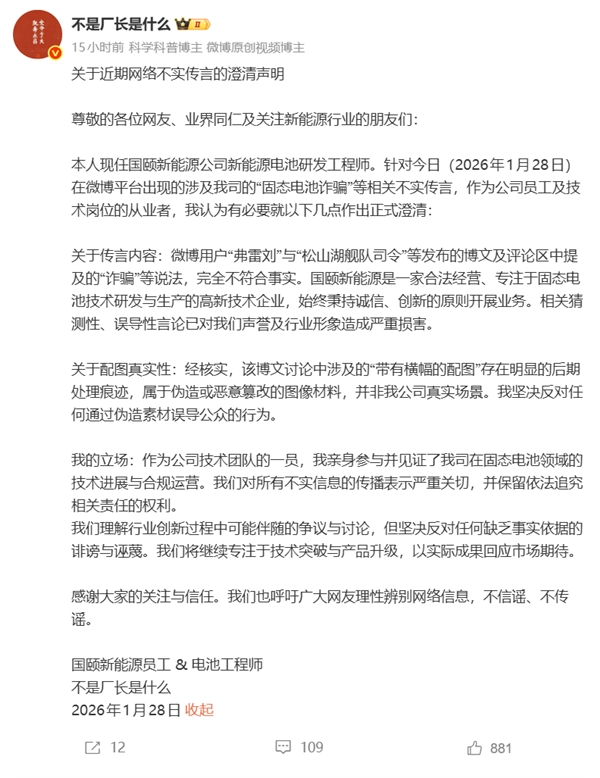 对此,一位自称是国颐新能源公司新能源电池研发工程师、网名为“不是厂长是什么”的博主,对外发布了澄清声明。