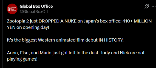 外媒Global Box Office在报道《疯狂动物城2》的票房表现时,以“投下核弹”来描述其市场冲击力,这一表述引发了广泛讨论。报道中提到:“《疯狂动物城2》在日本的票房表现犹如‘投下核弹’:上映首日便斩获超4.1亿日元的票房。这不仅是现象级的开局成绩,更一举创下日本影史西方动画电影的最高开画纪录。”